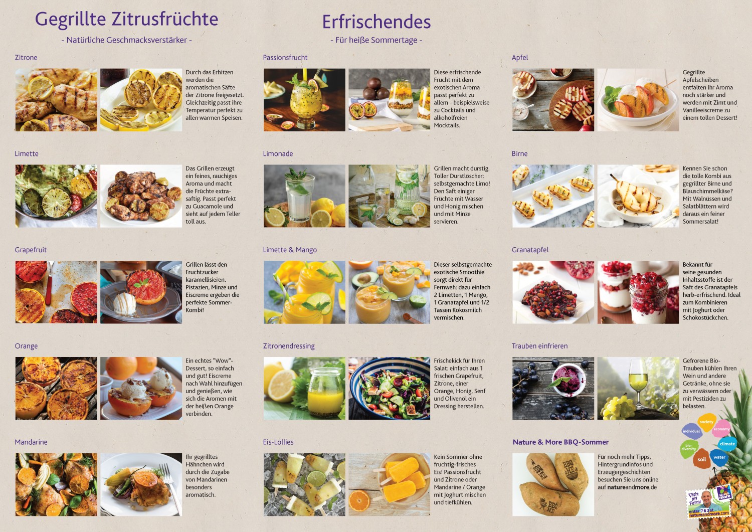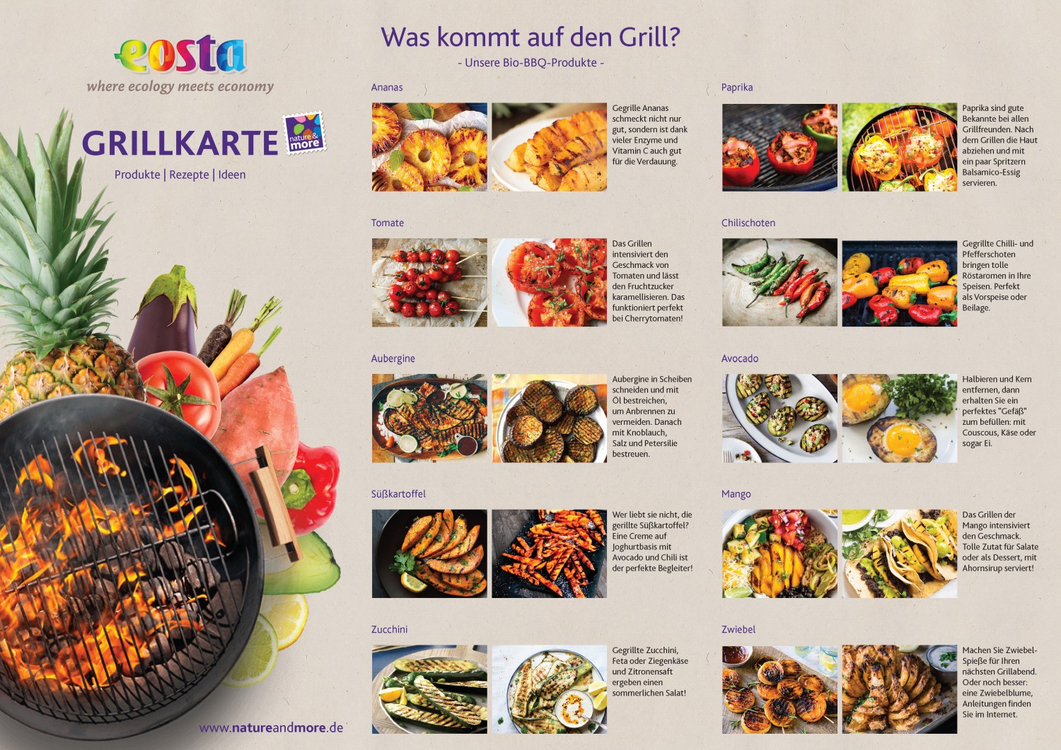 Immer in der Nähe: ein Grill und der typische Geruch nach Holzkohle und Geröstetem… Doch es muss nicht immer die obligatorische Bratwurst sein, die darauf brutzelt! Weil Bio-Obst und -Gemüse sich prima macht auf dem Rost, hat Nature & More eine spezielle Grillkarte entwickelt. Damit werden nicht nur Sie, sondern auch Ihre Kunden Feuer und Flamme!
