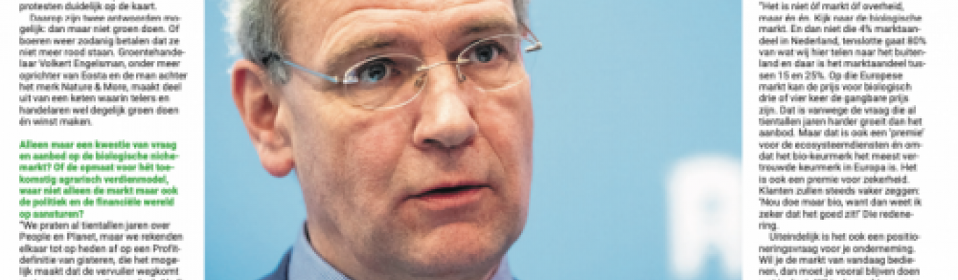 Volkert Engelsman nennt sich selbst ‘nur ein einfacher Gemüsehändler aus Waddinxveen’. Aber schon einer, der mit biologischem Gemüse und Obst handelt. Und einer, der letztes Jahr ein neues, eindrucksvolles Firmengebäude bauen ließ. Man kann also durchaus grün wirtschaften, ohne in den roten Zahlen zu landen.