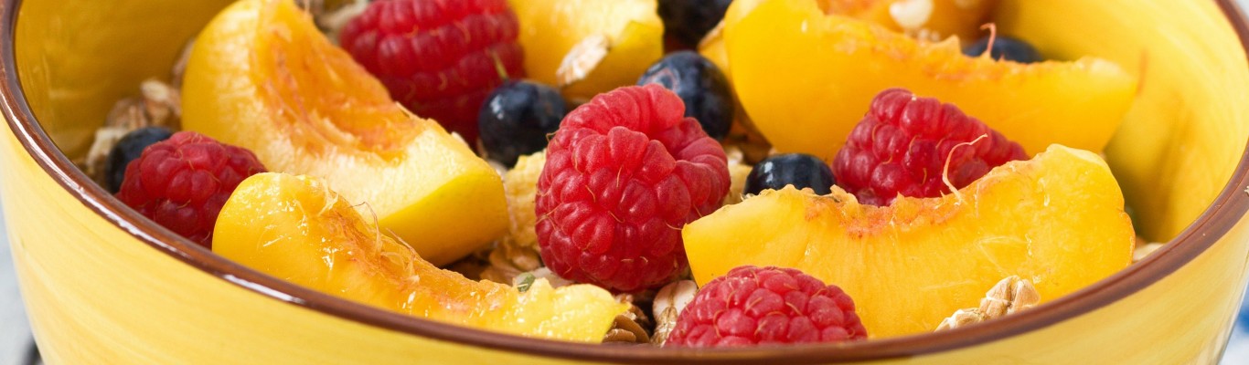 5.Verteile die Früchte auf vier Schüsseln und streue jeweils 1 EL Haferflocken darauf. Gebe anschließend das Jogurt-Dressing darüber und bestreue es mit den Chia-Samen.