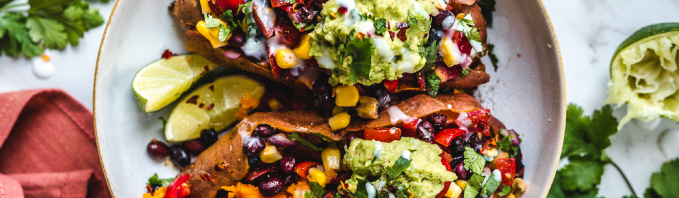 Mit einer Gabel die Mitte der fertig gegarten Süßkartoffeln zur Seite schieben und die Lücke mit Füllung bedecken. Mit einem großen Kleks Guacamole garnieren.