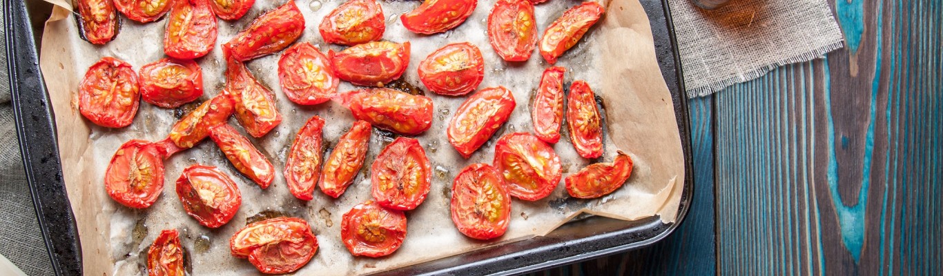 Preheat the oven to 100°C. Halve the tomatoes, cross the flesh in with a sharp knife and place the tomatoes with the section facing upwards tightly packed in a greased oven dish. Mix the Italian seasoning with the oil and spoon this over the tomatoes. Place the dish in the oven to dry the tomatoes for approx. 3 hours, leaving them a little moist. Allow to cool outside the oven, scoop them into a plastic container and store in the fridge until serving.