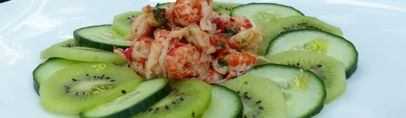 Put the kiwi and cucumber slices alternately on the plate. Put the crayfish in the middle. Garnish with finely chopped basil if you like.