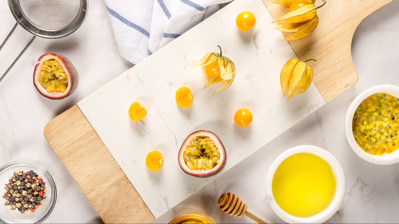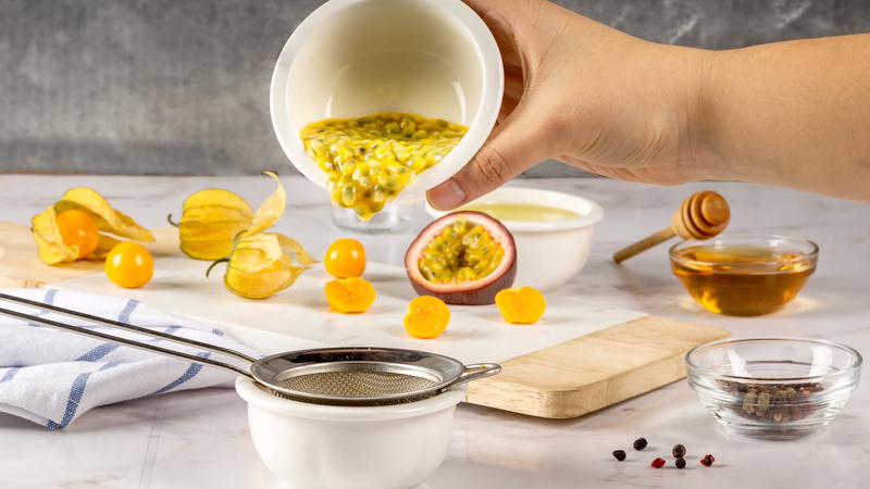 Scrape out the pulp and strain it through a sieve. Press it a little bit with a spoon to make sure you get all the juice out and discard the seeds.