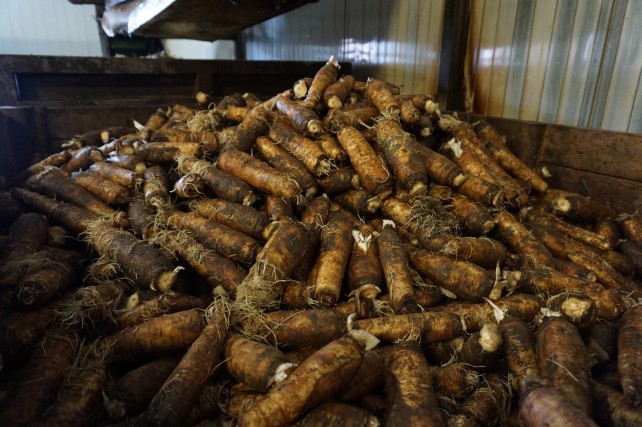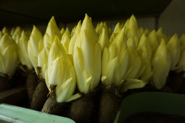 Herman : L’endive se cultive de façon particulière. La production prend en fait deux années (ou saisons). Pendant la première saison, la plante pousse dans le sol, à partir de la graine. Le plant de chicorée n’est pas comestible lors de cette première phase, il est donc donné au bétail. Cependant, sous le sol, ces plants développent une racine allongée très épaisse. Voilà le but de la manœuvre. Après récolte de ces longues racines, on les laisse hiberner, stockées à -1°C pendant 10 à 11 mois.