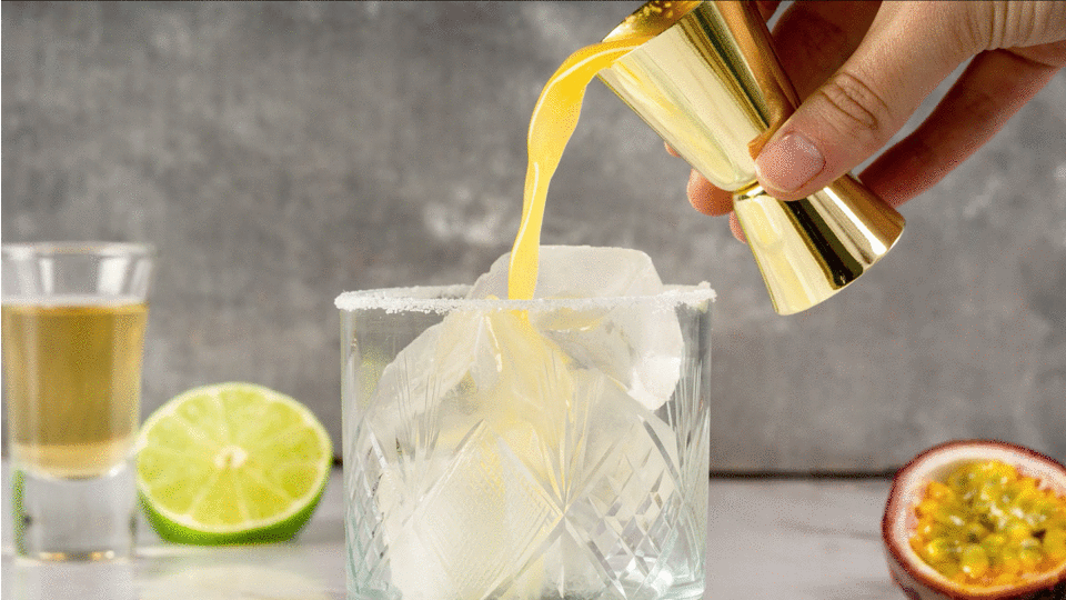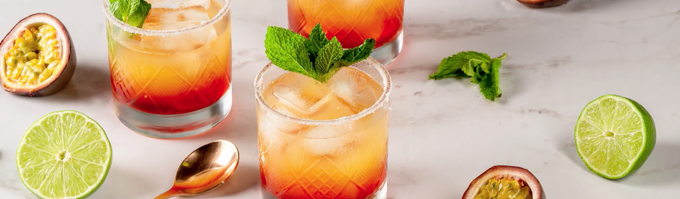 Retirez les graines de votre fruit de la passion, mélangez tous les ingrédients, ajoutez des glaçons et de la menthe.