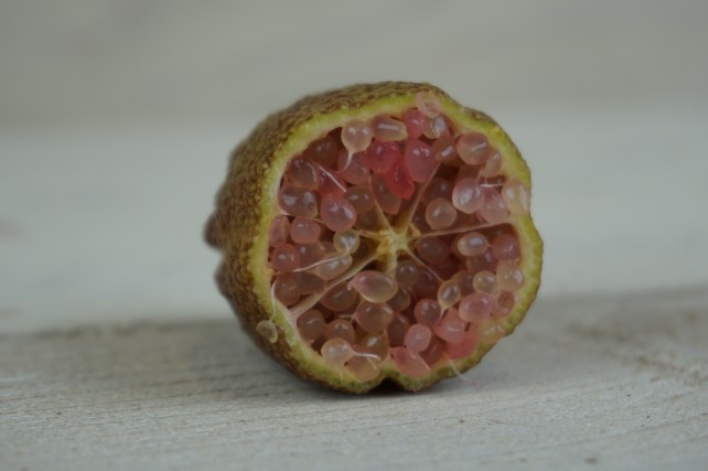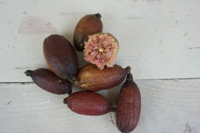 Rachida: ‘Citruskaviaar, ook wel microcitrus of finger lime genoemd, is een heel bijzondere sort citrus. De kleur van de schil varieert van donkergroen tot roodbruin en elke vrucht bevat glanzende bolletjes vrcuthvlees die er als kaviaaar of uitzien en een frisse limoensmaak hebben. Wat ik er het mooiste aan vind is dat ze in je mond uit elkaar spatten in een explosie van smaak.’