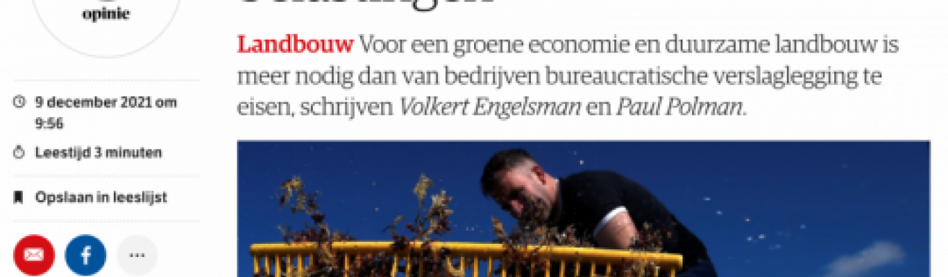 Op 9 december verscheen in NRC onderstaand opiniestuk door Paul Polman, auteur van "Net positive: how courageous companies thrive by giving more than they take" en voormalig directeur van Unilver, en Volkert Engelsman, CEO van Eosta. Zij stellen dat de doorbraak van een nieuw duurzaam paradigma in de landbouw en economie niet langer te ontkennen is en pleiten daarom voor een herziening van het financiële stelsel, specifiek het belastingstelsel. Europese rapportageverplichtingen zijn niet genoeg om bedrijven intrinsiek te motiveren en zorgen ervoor dat alleen de allergrootste bedrijven de weg weten te vinden naar de Europese landbouwmiljarden.