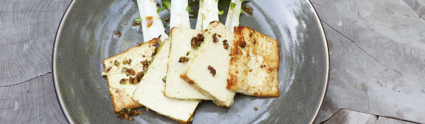 Leg de paksoi op de borden en besprenkel het met wat ketjap. Leg de plakken tofu er op en serveer direct.